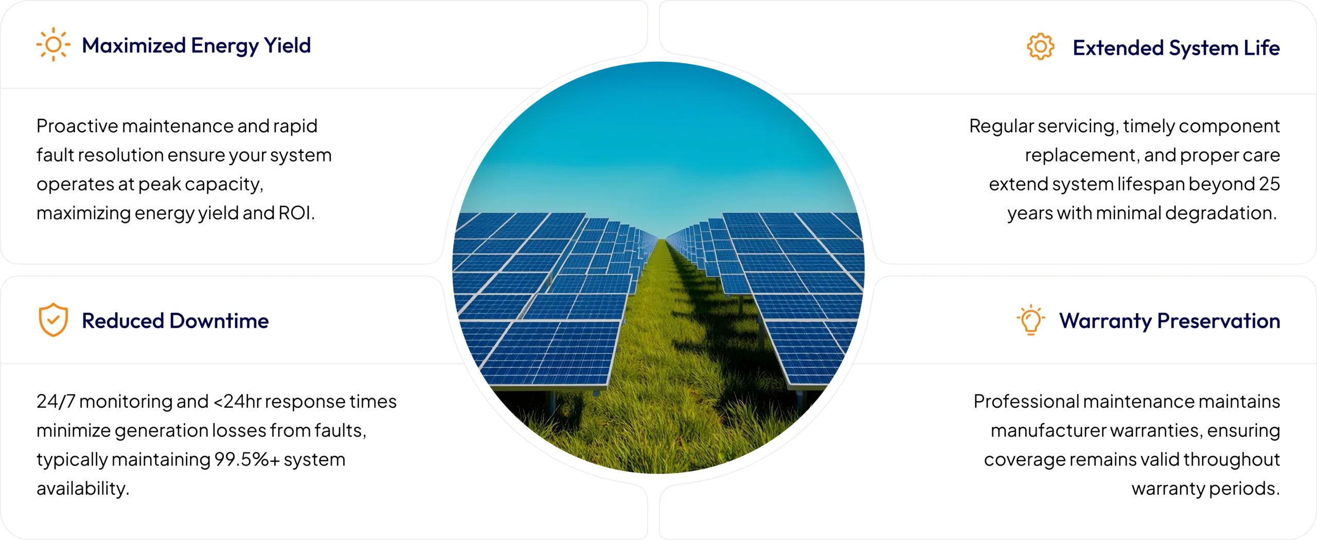Maximize your solar investment with end-to-end O&M services. We ensure peak performance through real-time monitoring, preventive maintenance, and quick issue resolution—reducing downtime, boosting energy output, and delivering reliable returns over the system’s lifetime.