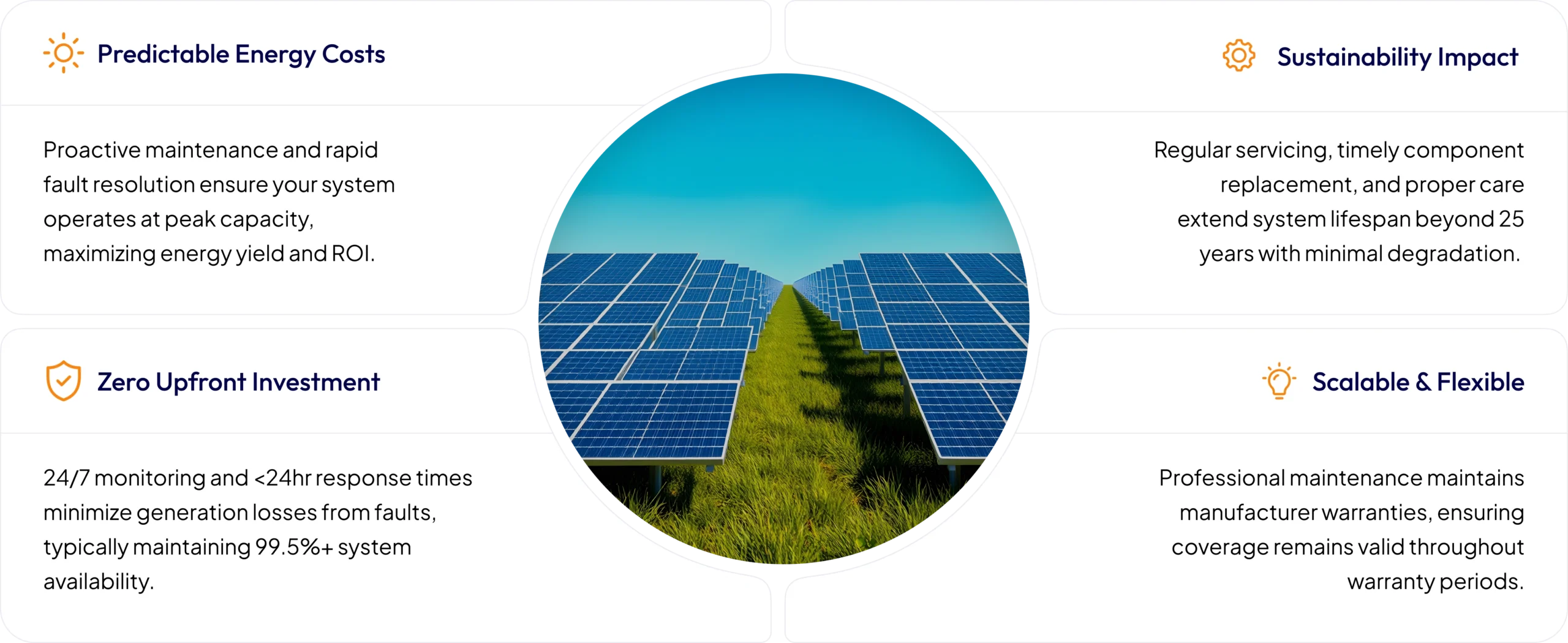 We engineer systems for maximum power and longevity. With proactive care, your infrastructure will deliver high-performance energy for 25+ years with minimal wear.